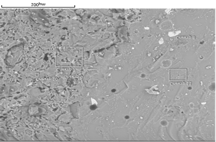 - Микроструктурный анализ (СЭМ-ЭДС) показал равномерное распределение кристаллических фаз в глазурном покрытии и их хорошую диффузию в керамическую основу, что обеспечивает прочность и долговечность.