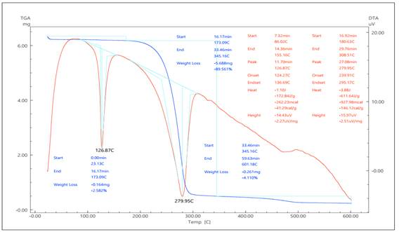 В ТГА образца с повышением температуры наблюдаются изменения массы исследуемой навески вещества. Потеря основной массы при термическом разложении всех соединений происходит в интервале температур от 100 °С до 600 °С. Термогравиметрическим анализом установлено, чтo при температуре 86-155oС навеска БТАК потеряет 2,6% массы. При 126 oС наблюдается эндoтермический пик (∆Q=-172.84 J/g), который соответствует температуре плавления исследуемого соединения. Дальнейшее нагревание при 279,95 oС потеря массы образца составляет 89,56%.