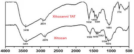Для хитозана характерна широкая полоса поглощения в области 3200–3500 см⁻¹, соответствующая колебаниям валентных связей N–H и O–H. Полосы поглощения при 2878 см⁻¹, 1600 см⁻¹, 1156 см⁻¹ и 1078 см⁻¹ относятся соответственно к валентным колебаниям связей C–H, амидных групп, колебаниям связи C–O–C, а также к колебаниям C–O вторичных гидроксильных групп.
