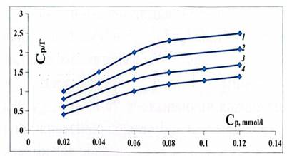 Figure 5. The adsorption isotherms of heavy metal ions (Cu2+, Zn2+, Cr6+, Ni2+) by modified kaolin adsorbents (1 - Cu2+; 2 - Zn2+; 3 - Cr6+; 4 - Ni2+)