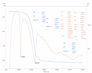 Разложение всех трех веществ происходит в два этапа. Однако ацетоацетанилид мета-нитробензоилгидразона термически устойчив и не полностью разлагается до 800 °C. Второе вещество проявило умеренную стабильность, в то время как третье вещество полностью разлагается при 285 °C, что указывает на его относительно низкую термическую стабильность. Во всех синтезированных веществах наблюдались только эндотермические реакции, м-нитробензоилгидразон ацетоацетанилида повышает термическую стабильность молекулы за счет наличия нитрогруппы, что позволяет хранить вещество без разложения даже при высоких температурах.
