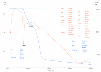 Нами в качестве образца был взят 6,01 мг м-нитробензгидразона. Через 35,13 минут после начала процесса, т.е. в интервале 33,04–372,11 oC, образец потерял 5,491 мг массы. Это составляет 84% от общей массы. За этот промежуток времени наблюдались два эндотермических эффекта при 174,17 oC и 192,83 oC, а также поглощалось 717,02 mJ и 126,52 mJ энергии соответственно, пик эндотермического эффекта наблюдался при 158,47 oC и 214,4 oC. Второй этап продолжался с 35 до 79 минуты. При повышении температуры с 372,11 оС до 801,84 оС распадается 8,013 % (0,528 мг) от общей массы образца (рис. 1а, табл 1).