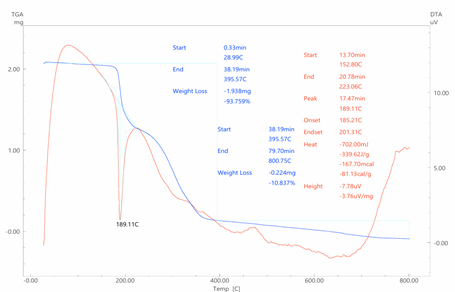 м-гидроксибензгидразон (C17H17N3O3) ацетоацетанилида для анализа было взято 2,02 мг, процесс нагревания начался в через 0,33 мин. при 28,99 оС и вещество разлагалось в 2 стадии. Первый этап продолжался 37,9 минут после начала нагревания с патерой массы 1,938 мг при достижении температуры до 395,57 оС. На первом этапе основная часть образца была разрушена. Линии дифференциального термического анализа (ДТА) показывают, что в диапазоне температур от 185,2 оС до 201,31 оС из вещества поглощалось -702,00 мДж энергии, а пик эндотермического эффекта составил 189,11 оС. Второй этап завершился при температуре от 396 оС до 801 оС и потеря массы составляет 0.224 мг. (рис. 1б, табл. 1).