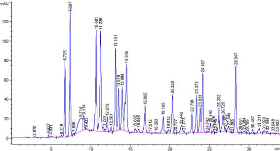Определение аминокислотных остатков. Осаждение белковипептидов водного экстракта образца проводили в центрифужных стаканах. Для этого к 1 мл исследуемого образца добавляли по 1,00 мл 20%-ного водного раствора трихлоруксусной кислоты и оставляли на 10 минут. Затем осадок отделяли центрифугированием при 8000 об/мин в течение 15 минут. Отделив 0,1 мл супернатанта, лиофильно высушивали. Гидролизат упаривали, сухой остаток растворяли в смеси триэтиламин-ацетонитрил-вода (1:7:1) и высушивали. Эту операцию повторяли дважды для нейтрализации кислоты. Реакцией с фенилтиоизоцианатом получали фенилтиокарбамоил-производные (ФТК) аминокислот [14]. Идентификацию производных аминокислот проводили методом ВЭЖХ (Рис 1).