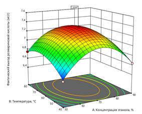 Визуализация поверхности отклика (Рисунок 1) демонстрирует наличие выраженного максимума выхода розмариновой кислоты в области средних значений температуры и концентрации этанола. Снижение выхода при высоких температурах (>80°C) и высокой концентрации этанола (>90%) связано, вероятно, с деградацией термолабильных фенольных соединений и изменением полярности экстракционной среды.