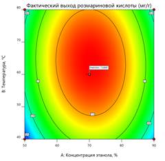 где Y – выход розмариновой кислоты (мг/г), A – концентрация этанола (%), B – температура (°C), C – время экстракции (мин).