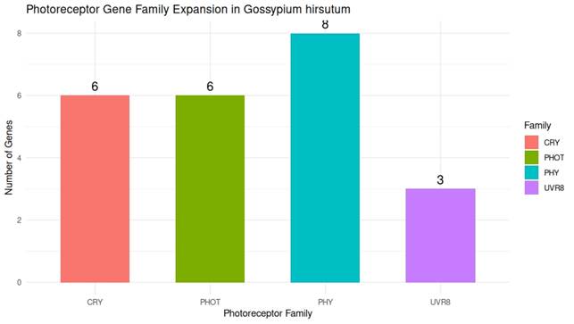 Bar chart illustrating the number of genes belonging to the four major photoreceptor families-phytochromes (PHY), cryptochromes (CRY), phototropins (PHOT), and UV RESISTANCE LOCUS 8 (UVR8)—identified in the G. hirsutum genome