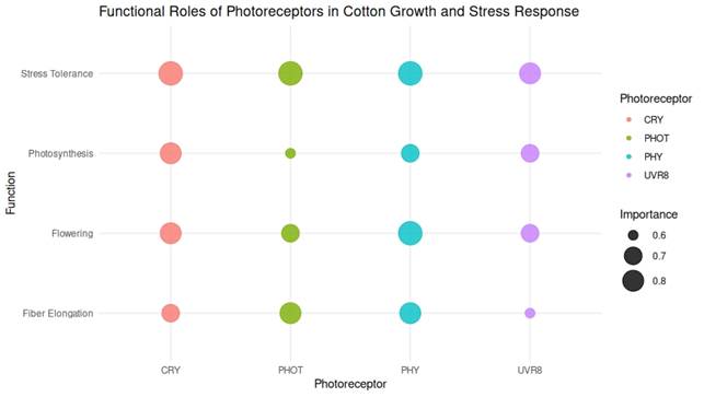 Bubble diagram illustrating the relative functional importance of four major photoreceptor families-phytochromes (PHY), cryptochromes (CRY), phototropins (PHOT), and UV RESISTANCE LOCUS 8 (UVR8)—in regulating key developmental and physiological processes in cotton. Each bubble represents a specific function: flowering control, fiber elongation, photosynthesis, and abiotic stress tolerance. The bubble size corresponds to the relative contribution (Importance value) of each photoreceptor pathway, showing that PHY and CRY predominantly regulate flowering and photomorphogenesis, PHOT contributes to photosynthetic adjustment, while UVR8 plays a central role in UV and oxidative stress protection (Figure 3).