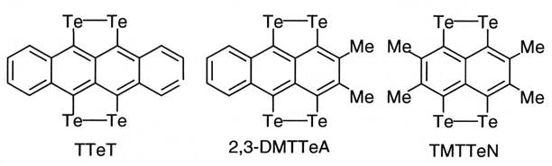 Наиболее обещающими кандидатами на формирование органических металлов рассматривались донорные молекулы полиаценов, содержащих пери-дителлуровые мосты, такие как, TТeT (тетрателлуротетрацен) [8,9], 2,3-DMTTeA 7(3,4-диметилантра[1,9-cd:4,10-c’d’]бис[1,2]дителлурол) [6,10] и TMTTeN (2,3,6,7-тетраметилнафто[1,8-cd:4,5-c’d’]бис[1,2]дителлурол) [7,11]. Это предположение основывалась на том, что атомные характеристики теллура могли играть основную роль в образовании кристаллических структур и физических свойств соединений на основе этих донорных молекул. Однако, вследствие слабой растворимости теллур-содержащих донорных молекул в органических растворителях и проблем синтеза монокристальных образцов не всегда удавалось получить образцы пригодные для исследования. Были сообщения о синтезе катион-радикальных солей на основе комплексов HMTTeF (гексаметилентетрателлурофульвален) [12] и TTeF (тетрателлурофульвален) [13], электропроводности которых при комнатной температуре оказались очень малыми и показывали полупроводниковый характер зависимости электропроводности от температуры. Впоследствии были получены соединения 2,3-DMTTeA с бромом [6], электропроводности которых при комнатной температуре были достаточно высоки, однако и у них температурная зависимость электропроводности показывали полупроводниковый характер. Причина такого поведения в данном соединении объяснялась наличием ориентационного беспорядка донорных молекул полиаценов, которые возникали из-за асимметричности молекул. Поэтому в дальнейших исследованиях основное внимание уделялось симметричным донорным молекулам, в частности, TMTTeN (2,3,6,7-тетраметилнафто[1,8-cd:4,5-c’d’]бис[1,2]дителлурол), растворимость которых в органических растворителях были сравнительно выше, вследствие наличия четырех метиловых групп в конфигурации молекулы. Молекулярные структуры вышеупомянутых теллурсодержащих донорных молекул показаны на рис.1.