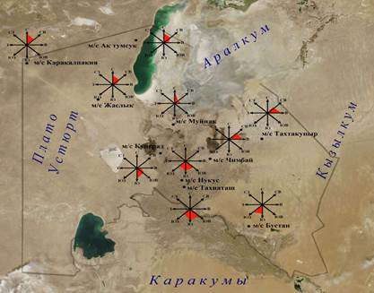 Рисунок 1. Метеостанции на территории Южного Приаралья и направления ветра во время анализируемой ниже конкретной ПБ