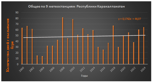 Заключение. В работе исследованы межгодовой режим пылевых бурь в Южном Приаралье, сингулярный режим среднестатистической пылевой бури и режим конкретной, произошедшей 22.08.2025г. пылевой бури. При анализе межгодового режима пылевых бурь мы исходили из того, что их динамика находится в противофазе с межгодовой динамикой количества осадков. По результатам статистического анализа, эта противофаза особенно четко проявляется на метеостанциях Устюрта. В среднем по метеостанциям Южного Приаралья коэффициент корреляции равен -0,231, что свидетельствует о существенной роли осадков в подавлении пылевых явлений. Учитывая, что по анализу данных метеостанций случаи пылевых бурь спустя 1-2 суток после осадков не встречаются, можно сделать вывод, что искусственные осадки накануне прогнозируемого сильного ветра в местности с потенциальными очагами пыли, могут практически исключать возникновение пылевой бури в этой области. Как закономерность межгодового режима пылевых бурь в Южном Приаралье, выявлено снижение годового количества осадков с устойчивой тенденцией осредненной по региону 0,7 мм/год, и увеличение количества дней с пылевыми бурями со средними темпами 6,7 % в год.