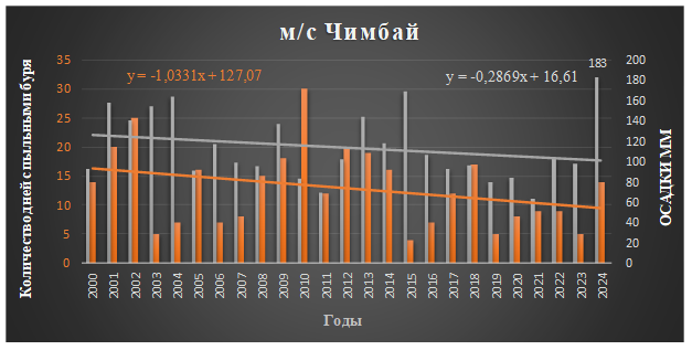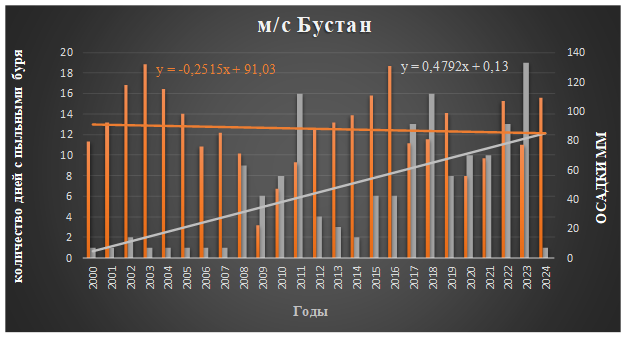 Рисунок 3. Пылевые бури и осадки на метеостанциях Бустан и Чимбай