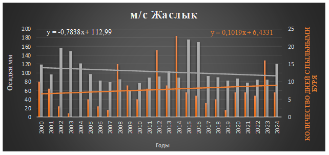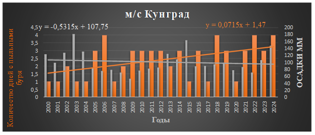 Рисунок 4. Пылевые бури и осадки на метеостанциях Кунград и Жаслык