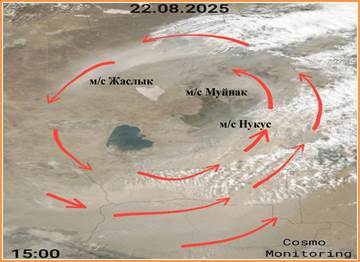На метеостанциях Каракалпакия и Жаслык 22-августа преобладали ветра северного и северо-восточного направления, максимальная скорость ветра достигала 20-25 м/c. В Кунграде в основном северный ветер, максимальная скорость ветра 20 м/c. На станции Муйнак скорость ветра 5-10 м/c, направление ветра северное. На Чимбайской и Тахтакупырской метеостанциях в основном направление ветра северо-восточное, скорость ветра 7-12 м/c. В остальных центральных и южных районах направление ветра южное и юго-западное, скорость ветра 7-10 м/c.