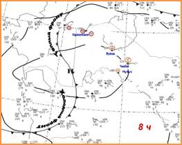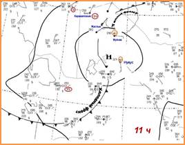 Рисунок 7. Синоптические карты развития циклона в 8ч. и 11ч. по местному времени.