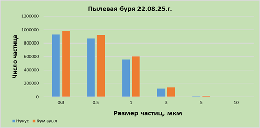 Анализ сингулярного режима среднестатистической пылевой бури и режима конкретной, произошедшей 22.08.2025г. пылевой бури показал преобладание мелкодисперсной фракции 79% осаждающейся массы пыли. Учитывая, что тяжелые частицы (более 20 мкм) осаждаются непосредственно вблизи очага пылевой бури не далее 20 км, можно утверждать, что пыль, наблюдавшаяся в г.Нукусе 22 августа 2025 года, является концевой частью шлейфа пылевой бури в Каракумах на территории Туркменистана. Мелкодисперсная пыль (РМ2,5) концевой части шлейфов пылевой бури (на расстоянии 200-500 км от очага) представляет особые риски для здоровья населения при многократном превышением ПДК. Таким образом, для населения Южного Приаралья, сосредоточенном в Нижне-амударьинском оазисе, существенно опасны пылевые бури с очагами в окружающих пустынях, особенно на Аралкуме вследствие высокого содержания токсичных сульфатов.