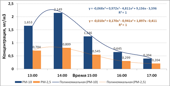 Всемирной организацией здравоохранения (ВОЗ) установлены стандарты качества воздуха: суточной ПДК для частиц с размерами меньше 10 мкм (РМ10) и частиц с размерами меньше 2,5 мкм (РМ2,5), которые соответственно равны 0,3 и 0,06 мг/м3. По таблице 5 можно заключить, что концентрация наиболее опасной для здоровья фракции РМ2,5 составляет 44% мелкодисперсной пыли.