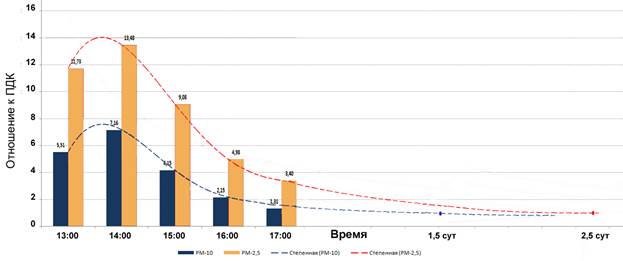 Тренды динамики соотношений измеренных концентраций с ПДК показывают, что РМ10/ПДК становится меньше единицы через 1,5 сутки после начала пылевой бури. Что касается соотношения РМ2,5/ПДК, то оно становится меньше единицы только через 2,5 сутки после начала пылевой бури. Субмикронные частицы остаются в воздухе в течение 1-2 недель.