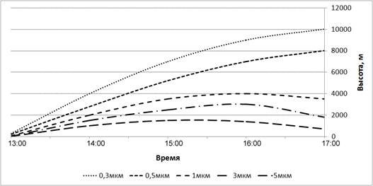 Различия в динамике концентрации обусловлены различиями в динамике распространения частиц разных размеров, которая в свою очередь зависит от скорости гравитационного осаждения. По модели турбулентной диффузии аэрозоля в нижних слоях атмосферы вычислены средние траектории частиц разных размеров (рис.12).