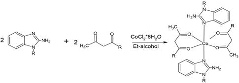 Синтез гетеролигандных комплексов кобальт (II) проводился по следующей методике: к 2 ммоль МАВ, растворенного в 10 мл этанола, прибавили 1 ммоль CoCl2·H2O. в 10 мл спирте. После перемешивания на магнитной мешалке в течение 30 минут к смеси добавляли 2 ммоль второго лиганда асас (или BNA), растворенного в 10 мл спирте. Смесь нагревали в течение часа, отфильтровывали в горячем виде и оставляли на кристаллизацию. Через несколько дней выпал зелёный мелкокристаллический осадок, который отфильтровали, несколько раз промывали этанолом и сушили на открытом воздухе. Перекристаллизацию вели, используя смесь ДМФА: ацетон (2:3). Выход 87 %. Реакция комплексообразования идёт по схеме 1. Полученные комплексы хорошо растворимы в ДМФA, ДМСО, малорастворимы в ацетоне и хлороформе, нерастворимы в воде, спирте и ацетонитриле. Выходы продукта, температуры плавления и результаты элементного анализа приведены в таблице 1.