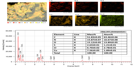 Рисунок 1. Микроструктура комплексного соединения [Co(acac)2(MAB)2] и данные ЭДА