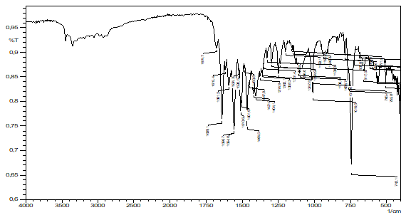 В ИК-спектрах исходных лигандов acac и BNA наблюдаются широкие колебания -OH групп в области 3320-3350 см-1 . Появление сильной полосы при 1740–1750 см-1 в спектрах лиганда относится к карбонильной группе (С=О), а при 1140–1130 см-1 – к колебанию группы (С–О). В ИК-спектре второго лиганда MAB наблюдаются валентные симметричные (νs) и асимметричные (νas) колебания νNH2 в области 3452–3200 см-1 . Деформационные колебания δNH2 дают не характеристические полосы умеренной интенсивности в области 1615–1655 см-1 для первичной аминогруппы и 1546 см-1 — для вторичной. Широкие полосы при 3087–3034 см-1 относятся к валентным колебаниям групп νСH, а полоса при 1595–1540 см-1 — к гетероароматической системе νС=N групп.