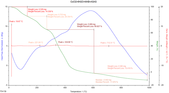 Для определения термической стабильности и состава полученных комплексных соединений проведен дифференциально-термический анализ (рис. 3). На кривой ДТА комплекса [Сo(acac)2(MAB)2] обнаружен экзотермический эффект при 95 °С, который соответствует удалению внешнесферной молекулы воды. Анализ кривой динамического термогравиметрического анализа (ДТГА) комплекса [Co(acac)2(MAB)2] показывает, что кривая ДТГА имеет место в основном в 3-х диапазонах интенсивных температур разложения.