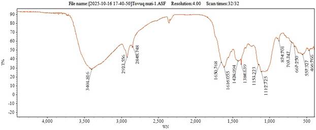 ИК-спектроскопический анализ птичьего помёта показал наличие широкого спектра функциональных групп, отражающих сложный органо-минеральный состав материала. На спектре (4000–400 см⁻¹) чётко выражена интенсивная широкая полоса при 3400–3410 см⁻¹, соответствующая валентным колебаниям О–H-связей гидроксильных и аминных групп, а также поглощению кристаллизационной воды. В области 2923–2856 см⁻¹ наблюдаются пики, характерные для симметричных и асимметричных колебаний связей C–H в метиленовых и метильных группах, что указывает на присутствие липидов и углеводородных остатков. Пик при 1650–1620 см⁻¹ относится к колебаниям C=O- и N–H-связей в амидных и карбонильных группах белковых соединений. Полоса около 1380–1390 см⁻¹ отражает наличие карбонат-ионов (CO₃²⁻) и солей органических кислот кальция и магния. Интенсивные пики в диапазоне 1155–1110 см⁻¹ соответствуют колебаниям P–O- и P=O-связей, подтверждая присутствие фосфатных соединений, участвующих в формировании фосфоорганических комплексов. В низкочастотной области (875–540 см⁻¹) фиксируются колебания, характерные для связей Si–O, SO₄²⁻ и Ca–O, что указывает на минеральную составляющую — золу.