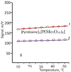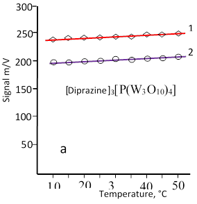 Figure 1. Dependence of the signal magnitude of ion-selective electrodes based on dodecaphosphomolybdate and dodecaphosphotungstate on the solution temperature for the detection of pyridoxine (a) and diprazine (b).