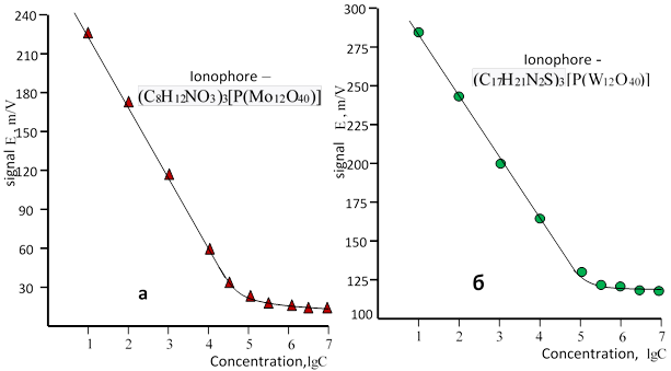 As can be seen from Figure 2, the operational range (Nernstian region) of the ISEs based on heteropoly metal phosphate ionophores for the detection of pyridoxine hydrochloride and diprazine hydrochloride corresponds to the concentration range of 1×10⁻¹ – 1×10⁻⁵ M.