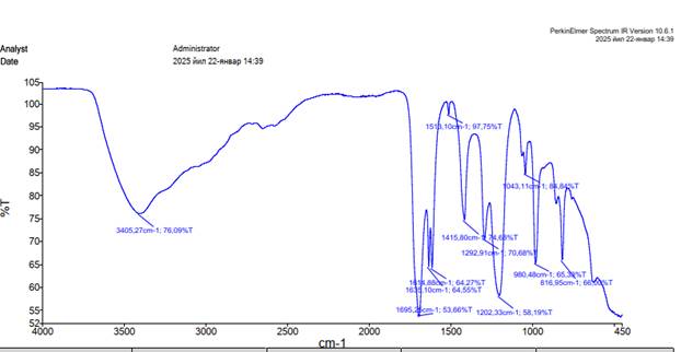 Как видно из рисунка, в ИК-спектре синтезированного эфира вино бис (акрилат) наблюдаются полосы поглощения. Полоса при 3405 см⁻¹ соответствует валентным колебаниям гидроксильных групп (–OH) в составе карбоксильных фрагментов (–COOH), что указывает на наличие незначительного количества непрореагировавшей карбоновой кислоты. Интенсивная полоса при 1695 см⁻¹ относится к валентным колебаниям карбонильных групп (C=O) и свидетельствует о формировании эфирной структуры в результате протекания реакции этерификации. Наблюдаются характерные полосы в области 1638 см⁻¹, что связано с валентными колебаниями двойных связей C=C (α,β-ненасыщенных участков, а это подтверждает сохранение ненасыщенных акрилатных фрагментов в молекулярной структуре синтезированного соединения. Такие фрагменты способны впоследствии вступать в реакции полимеризации. Кроме того, в области 1292–1202 см⁻¹ наблюдаются новые выраженные полосы, соответствующие валентным колебаниям связей C–O–C, что является прямым подтверждением успешного протекания реакции этерификации между карбоновой и акриловой кислотами.