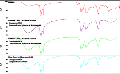 The FTIR spectra shown in Figure 2 compare the synthesized cotton-soapstock-based lubricity–dispersant (top) with three commercial additives (coconut oil diethanolamide and Ethox Amide). Overall, the spectra demonstrate that the synthesized product contains the same key functional groups characteristic of industrial lubricity–dispersants.