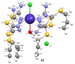 В кристаллической структуре комплекса (рис. 1) координационное число кобальта равно шести. Координационная сфера включает один атом хлора , одну молекулы воды и четыре молекулы лиганда (L), каждая из которых координируется к атому кобальта через атом азота тиадиазольного кольца. Кристаллы состава [CoL4(H2O)Cl]Cl имеют октаэдрическое строение: на вершинах октаэдра расположены атом хлора, молекула воды и четыре атома азота тиадиазольных колец, координированных с атомом кобальта. Второй атом хлора находится во внешней сфере и компенсирует положительный заряд комплекса, что соответствует катионной природе соединения.