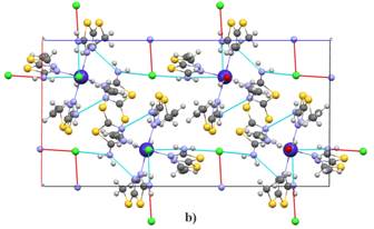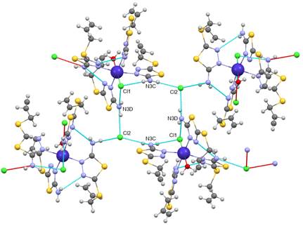 На рис. 2 показана упаковка молекул в кристалле. Атом хлора образует как внутримолекулярные, так и межмолекулярные водородные связи с атомами водорода аминогрупп. В свою очередь, атом Cl1 также образует внутримолекулярные водородные связи с водородами аминогрупп. Совокупность водородных связей, включающих атом Cl2, приводит к образованию замкнутыхциклов. Водородные связи N3D-H3DB...Cl2 и N3C-H3CB...Cl2 вытянуты вдоль направлений [001] и [010], образуя цепи, которые стабилизируют упаковку кристаллической решетки (табл. 2).