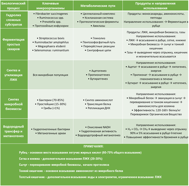Микробный консорциум рубца представляет собой высоко интегрированную экосистему с выраженной функциональной стратификацией и межвидовой кооперацией. Распределение метаболических ниш между целлюлолитическими, амилолитическими и сахаролитическими таксонами, дополненное пластичностью универсальных деструкторов и активностью эукариот, формирует многоуровневую трофическую сеть. Протеосинтетическая активность рубцового микробиоты, осуществляемая консорциумом бактерий, инфузорий и грибов, является основным источником биологически ценного белка для жвачных животных (Рис. 1).