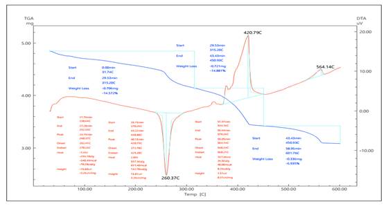 На термограмме синтезированного формиата натрия (рисунок 2) видно, что фиксируется эндотермический эффект, соответствующий плавлению при ~250 °C, а в интервале 315 °C наблюдается потеря массы на 14,57%. На DTA-кривой фиксируется эндотермический пик при 260,37 °C, что указывает на процесс разложения или испарения. Этот участок отражает нестабильную часть формиата натрия и показывает наличие в образце летучих компонентов, оставшихся после синтеза.