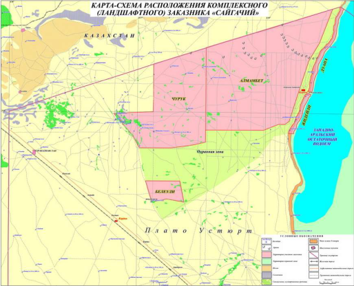 Исследуемая нами территория Комплексного (Ладшафтного) Заказника «Сайгачий» расположена на плато Устюрт и составляет 628,3 тысячи га общей площади (рис.1).