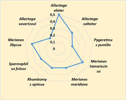 Проведенные исследования показали, что по соотношению экологических групп в сообществе грызунов на исследуемой территории преобладают псаммофилы, второстепенными видами являются виды-убиквисты. Анализ показал, что основная доля псаммофильных видов грызунов на территории Заказника «Сайгачий» составляет около 50–60 %, доля убиквистов составляет около 20 %. Основными представителями псаммофильных видов являются — Rhombomys opimus, Meriones libycus, Allactaga saltator и др. Основные представители грызунов-убиквистов — это Allactaga elater, Аllactaga severtzovi (рис. 2).