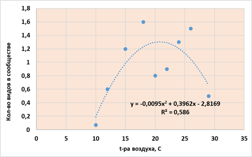 Многие виды живых организмов часто существуют в общем пространстве постоянного местообитания, что определяет разнохарактерность экологических сообществ. В то же время, при решении различных задач экологического профиля многие сталкиваются с конкретным местообитанием и экологическим пространством [19]. Интегральное использование индексов разнообразия позволяет дифференцировать сообщества по происходящим в них изменениям, обусловленным действием различных экзогенных и эндогенных факторов. Выявлена корреляционная связь между показателями видового разнообразия сообществ мелких млекопитающих и степенью влияния абиотических факторов (температура воздуха).