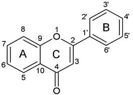 Рисунок 1. Структурное строение флавоноидов: 1) Кемпферол – 3,5,7,4ꞌ-OH; 2) Кемпферол-7-рамнозид – 3,5,4ꞌ-OH, 7-рамнозид; 3) Хризоэриол – 5,7,4ꞌ-OH, 3ꞌ-OCH3; 4) Апигенин – 5,7,4ꞌ-OH; 5) Лютеолин – 5,7,3ꞌ,4ꞌ-OH; 6) Цинарозид – 5,3ꞌ,4ꞌ-OH, 7-гликозид. |