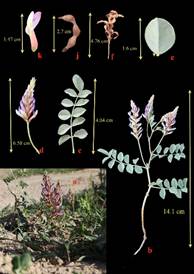 Рисунок 2. Иллюстративное изображение G. aspera. a) общий вид; b) стебель; c) сложный лист; d) соцветие; e) листовая пластинка; f) стручки; j) отдельный стручок; k) цветок