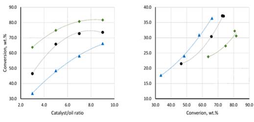 Испытания проводились в лабораторной установке с неподвижным слоем катализатора (Micro-activity test, ASTM D 3907) при температурах 527-590 °C и соотношении катализатор/сырье 2-6. В качестве сырья использовались: тяжелые – вакуумные газойли (VGO1, VGO2), остаток гидрокрекинга (VGO3); легкие – прямая нафта (N2) и нафта вторичного процесса (N1).