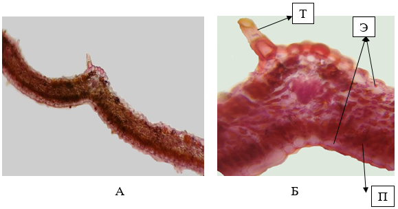 Рисунок 1. Поперечный разрез листа лекарственного растения Mentha piperita L.: А - общий вид, Б - основной проводящий пучок с трихомой. Т - трихома, Э - эпидерма, П - палисада