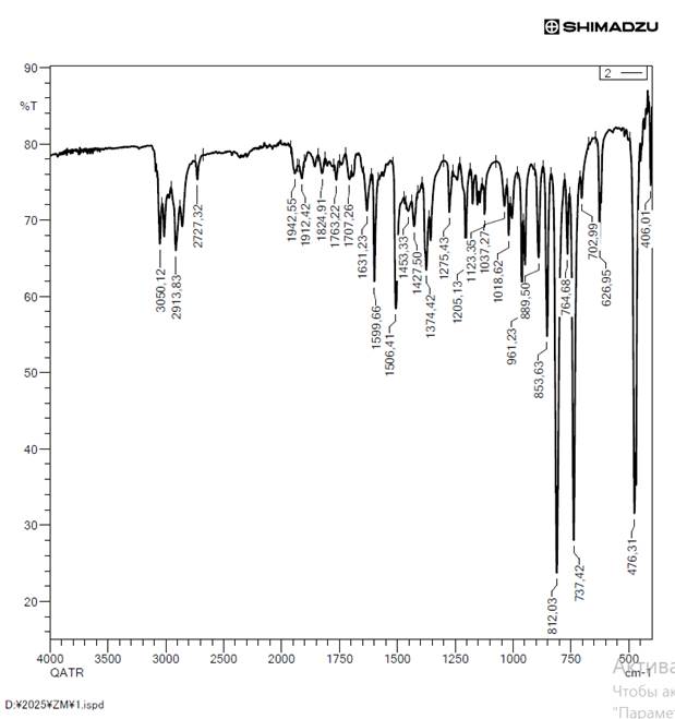 From the analysis of the IR spectrum of the isolated and purified naphthalene from pyrolysis oil, it can be seen that the valence vibrations of the C–H bond in the aromatic nucleus are observed in the regions of 2913.83 cm-1 and 3050.12 cm-1, deformation vibrations at 476.31 cm-1 and 626.952 cm-1, valence vibrations of the C=C bond at 1506.41 cm-1 and 1599.66 cm-1, and valence vibrations of the aromatic nucleus at 1506.41 cm-1 and 1599.66 cm-1.