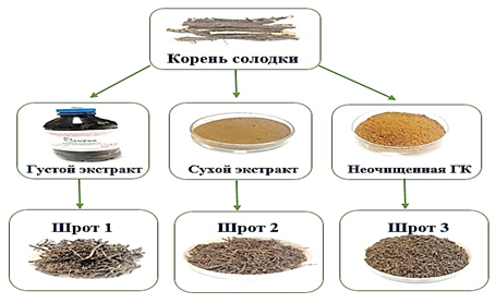 (Примечание: Шрот 1 – отход после получения густого экстракта; Шрот 2 – отход после получения сухого экстракта; Шрот 3 – отход после получения технической глицирризиновой кислоты).