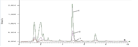 Рисунок 5. Сравнительные ВЭЖХ-хроматограммы содержания глицирризиновой кислоты в производственных остатках (шротах) корня солодки: 1 – шрот 1, 2 – шрот 2, 3 – шрот 3