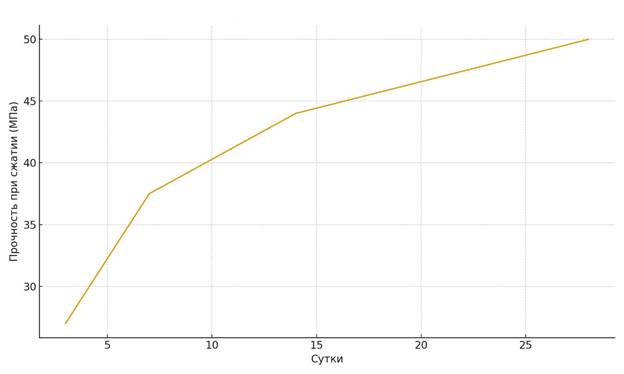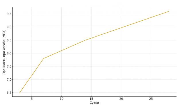 Механические испытания показали, что прочность образцов достигает 48–52 МПа при сжатии и 9,2–10 МПа при изгибе на 28 сутки, что соответствует требованиям к конструкционным цементным композитам.