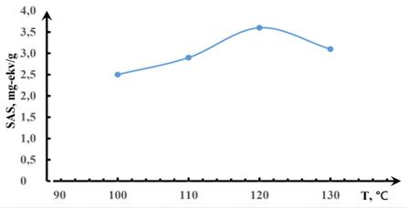 При повышении температуры реакции до 130 °С скорость реакции поликонденсации увеличивается, при этом время реакции снижается до 1,5-2 часов, а также уменьшаются величина статической обменной емкости и уровень набухания ионита. Отсюда был сделан вывод, что структура ионита, синтезируемого в этих условиях, более плотная, в результате чего подвижность ионогенных групп затрудняется. В результате проведенных исследований получены оптимальные условия для получения эффективного сорбента: температура реакции поликонденсации 120 °С, время реакции -2,5-3 часа. При этом обменная емкость по 0,1 Н раствору NaOH составила 3,6 мг- экв/г.