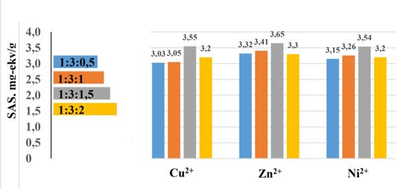 Согласно результатам, представленным в таблице 2 и на рисунке 2, ионообменники с лучшими характеристиками были получены при соотношении меламина, формальдегида и винной кислоты равном 1:3:1,5, соответственно. Статическая обменная емкость ионов металлов в 0,1н растворе составила Cu(II) 3,55 мг-экв/г, Zn(II) 3,65 мг-экв/г и Ni(II) 3,54 мг-экв/г.