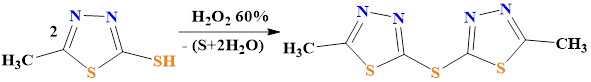 К суспензии МТДТ (5-метил-1,3,4-тиадиазол-2-тион) (0,02 моль) в этанольно-водной смеси (10 мл: 10 мл), при постоянном перемешивании и поддержании температуры 40°С, по каплям добавляли 60% раствор перекиси водорода (1,5 мл) (рис. 1). При этом раствор становился прозрачным и приобретал желтый цвет. Через час непрерывного перемешивания наблюдалось выпадение кристаллического осадка светло-желтого цвета (L). Полученный осадок был отделён фильтрованием и промыт дистиллированной водой, после чего высушен на воздухе до постоянной массы. Фильтрат оставляли на дальнейшую кристаллизацию. Выход реакции составил 84%, температура плавления полученного вещества составила - 116°С.